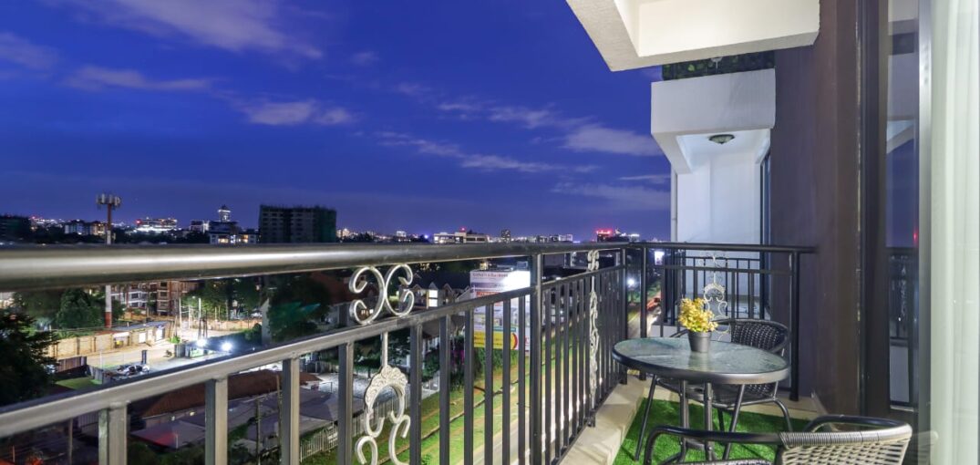 - Balcony with seats and grass carpet